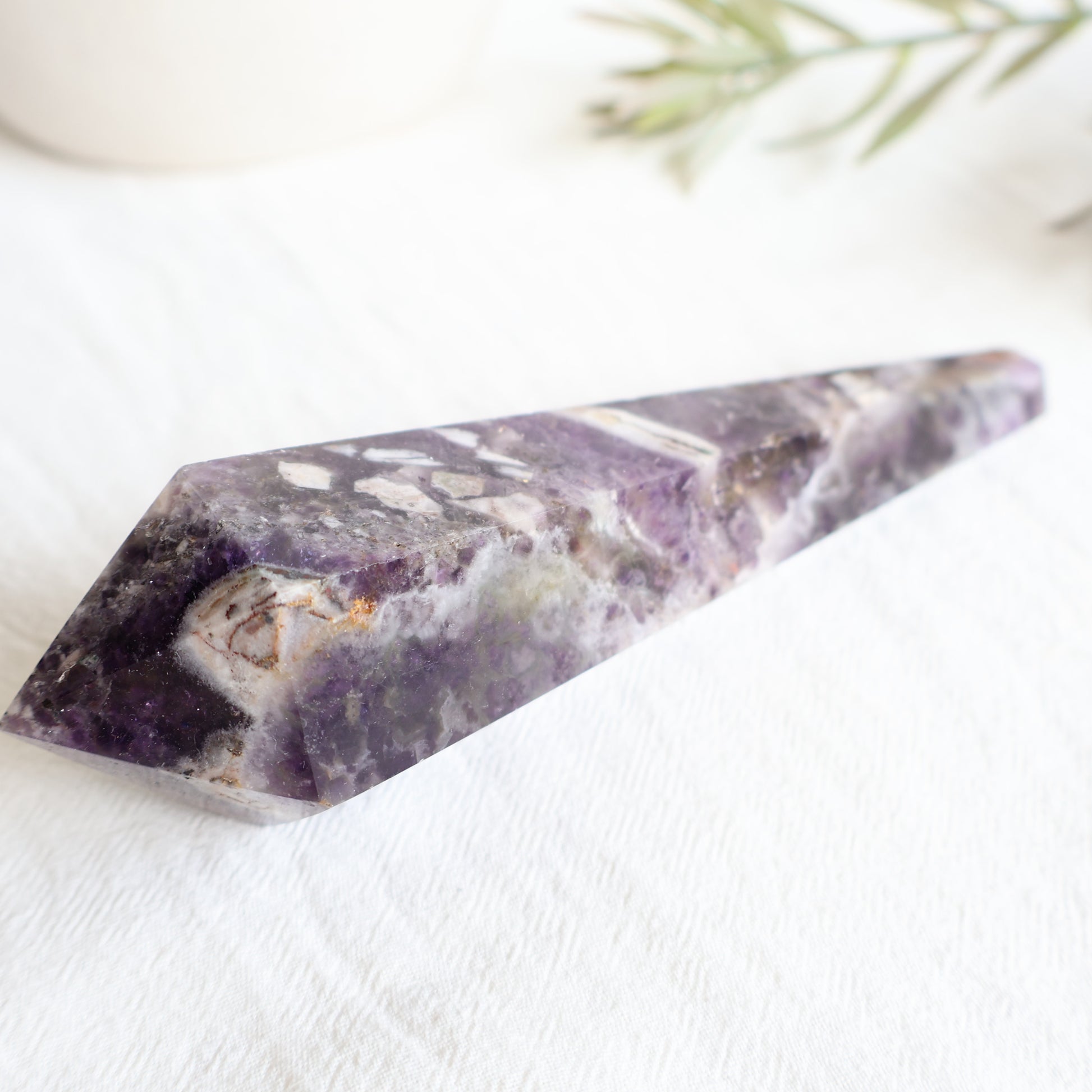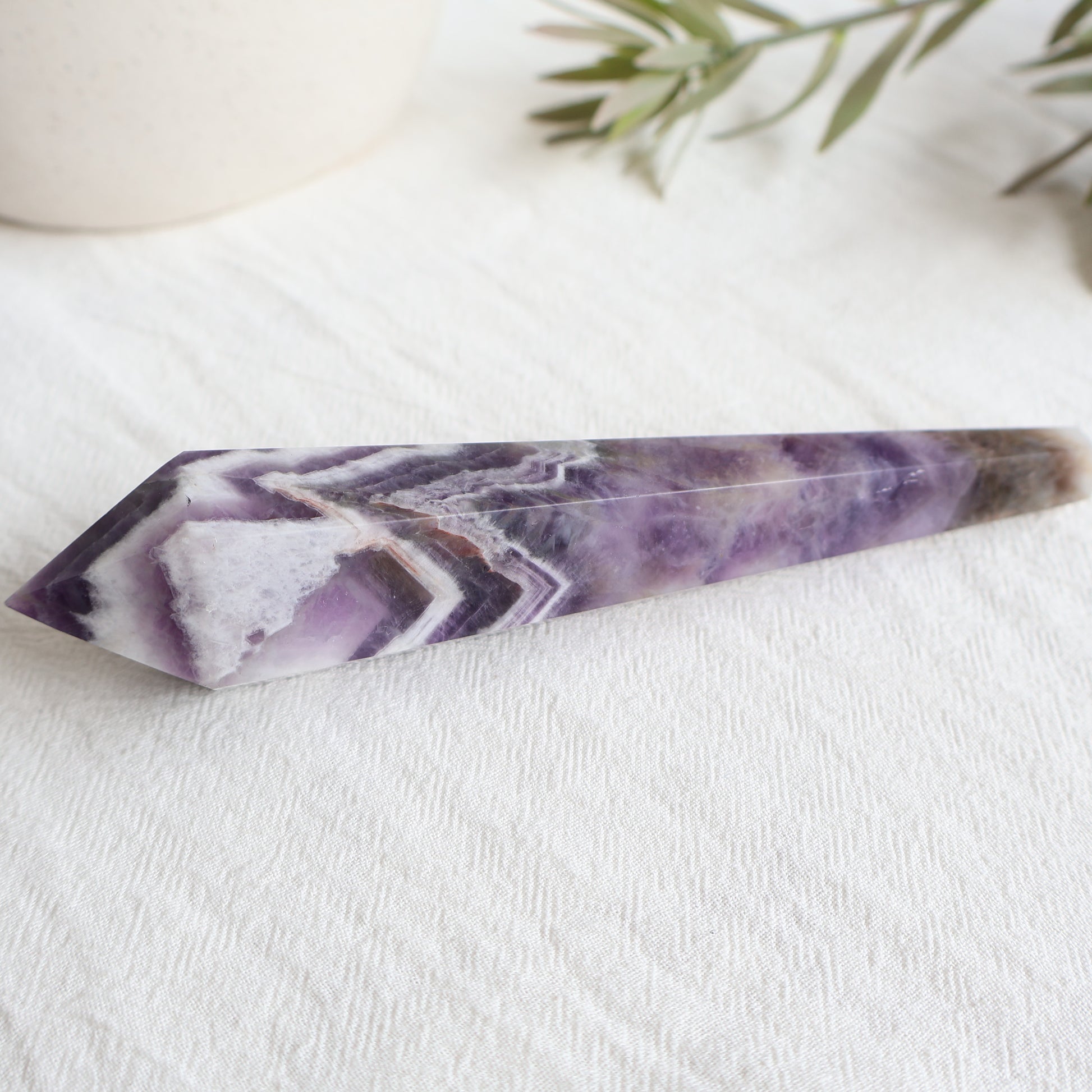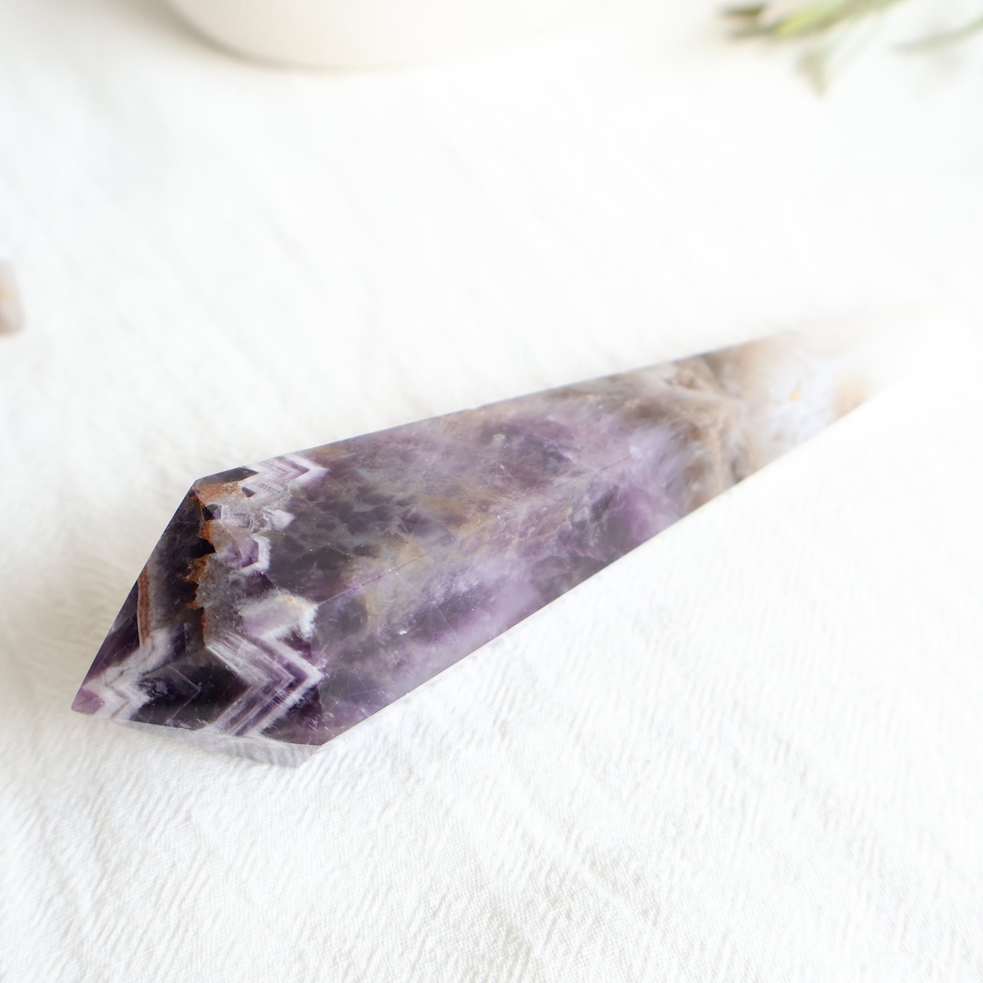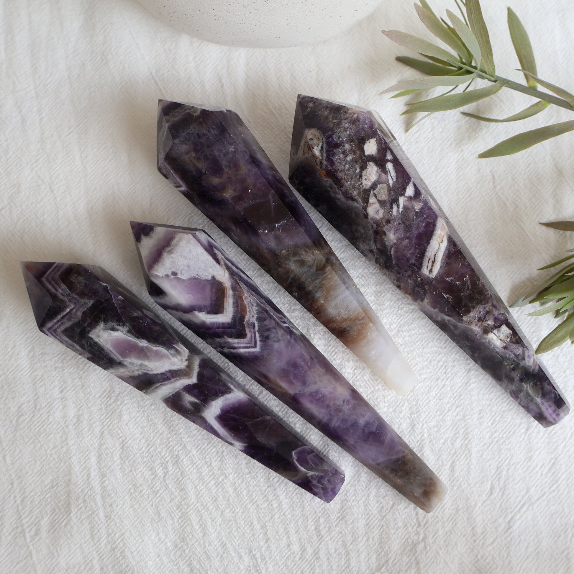 These six-sided Chevron Amethyst wands are beautifully polished and ideal for energy work, meditation, or display.