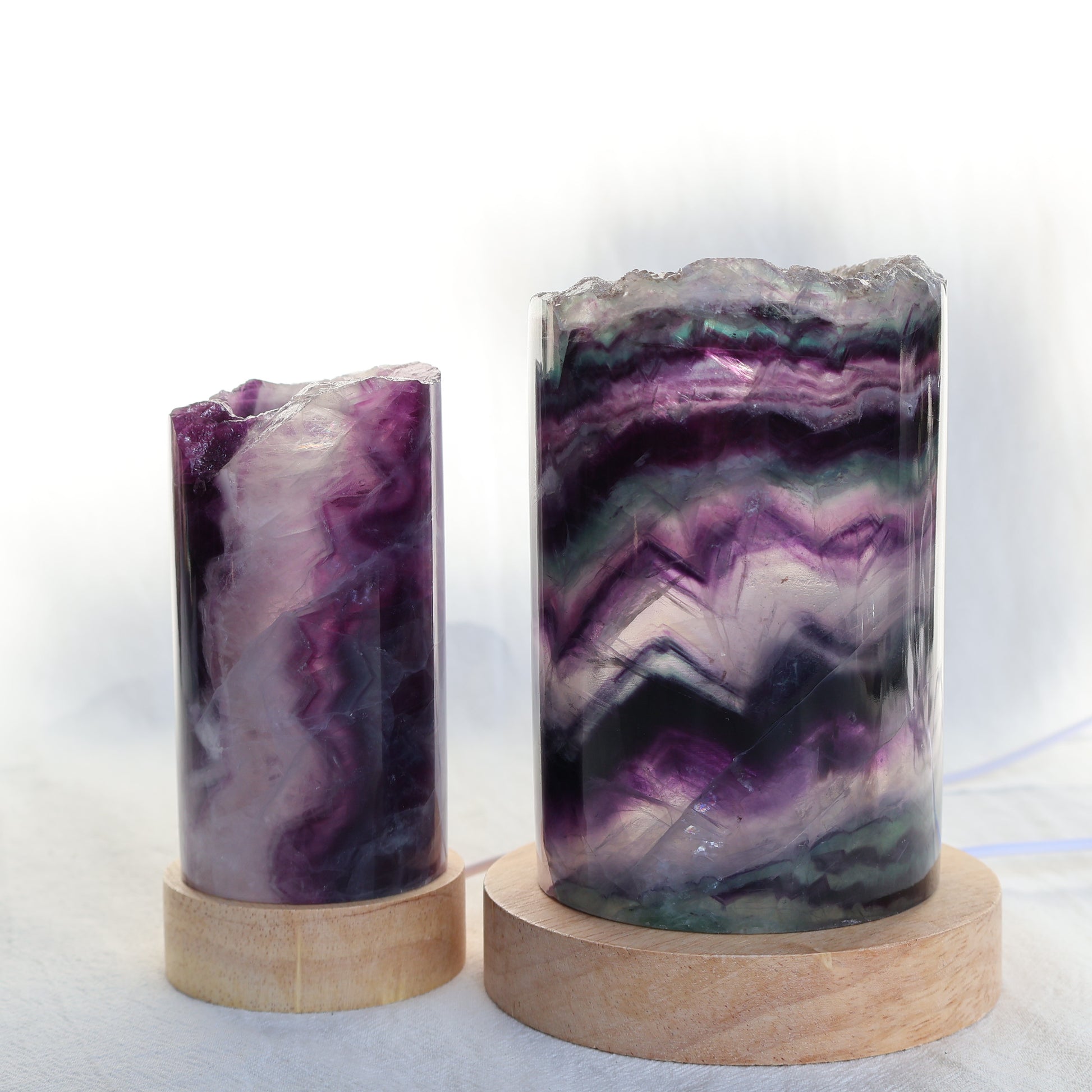 These Fluorite tubes each come with a USB light base and radiates soothing, multicolored light, casting a serene glow that uplifts and balances any room. Carved and polished to reveal Fluorite’s natural bands of vibrant colour.