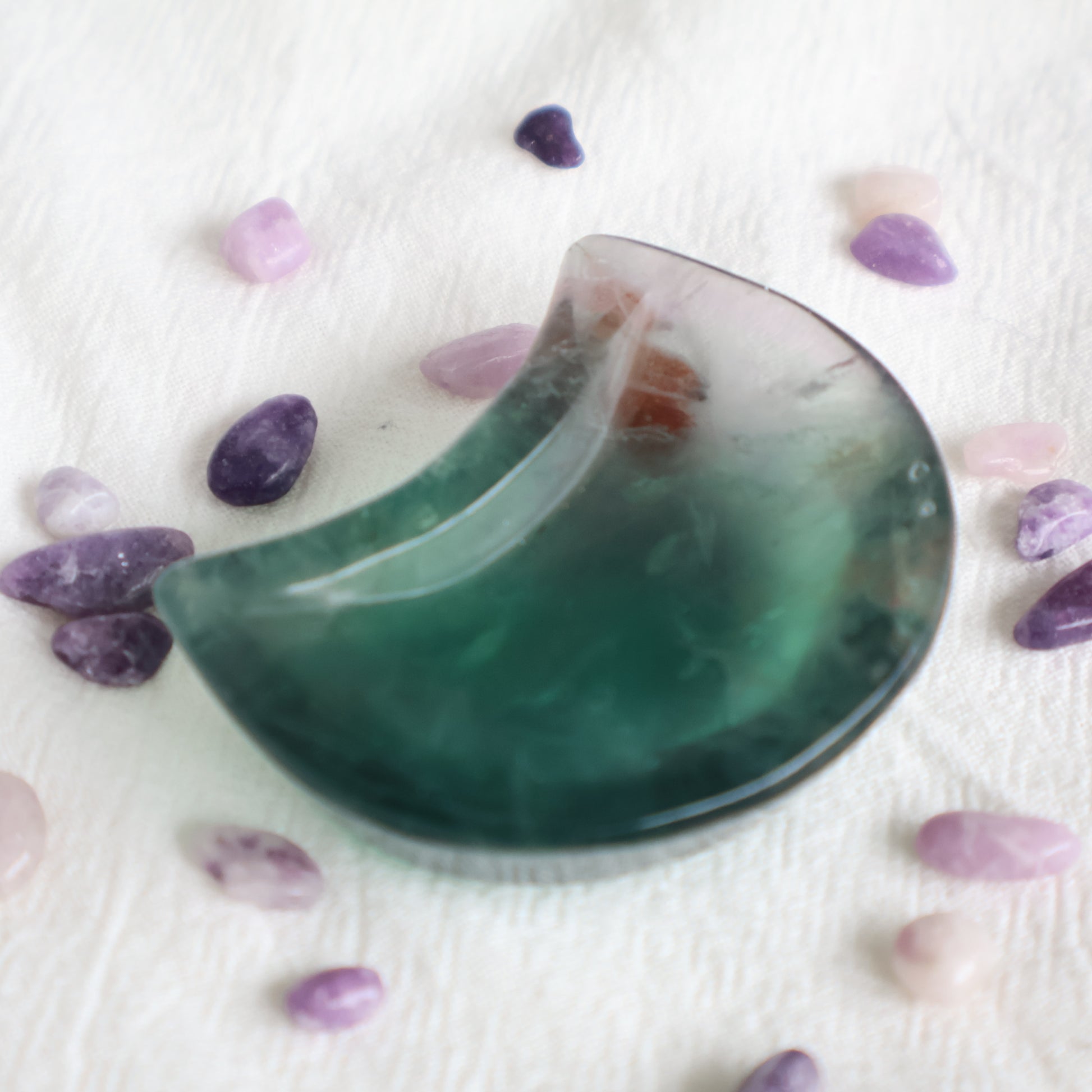 Delicate and dreamy, these small moon-shaped Fluorite dishes are perfect for holding rings, tumbles or chips.