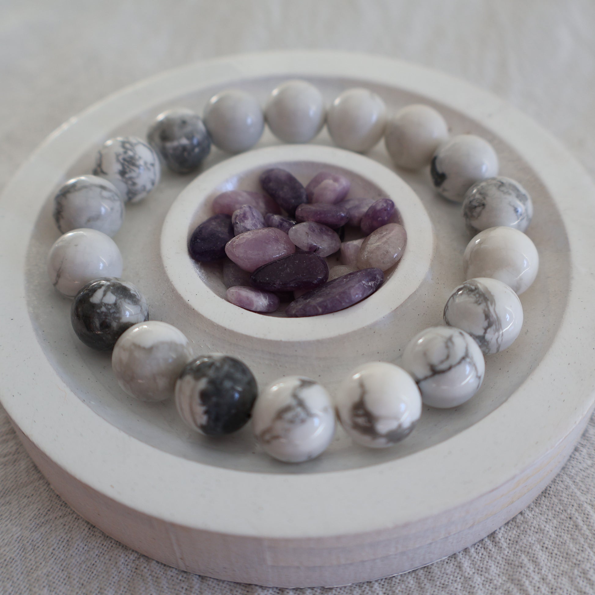 These 10mm bracelets showcase calming howlite beads, known for their soothing and grounding energy.