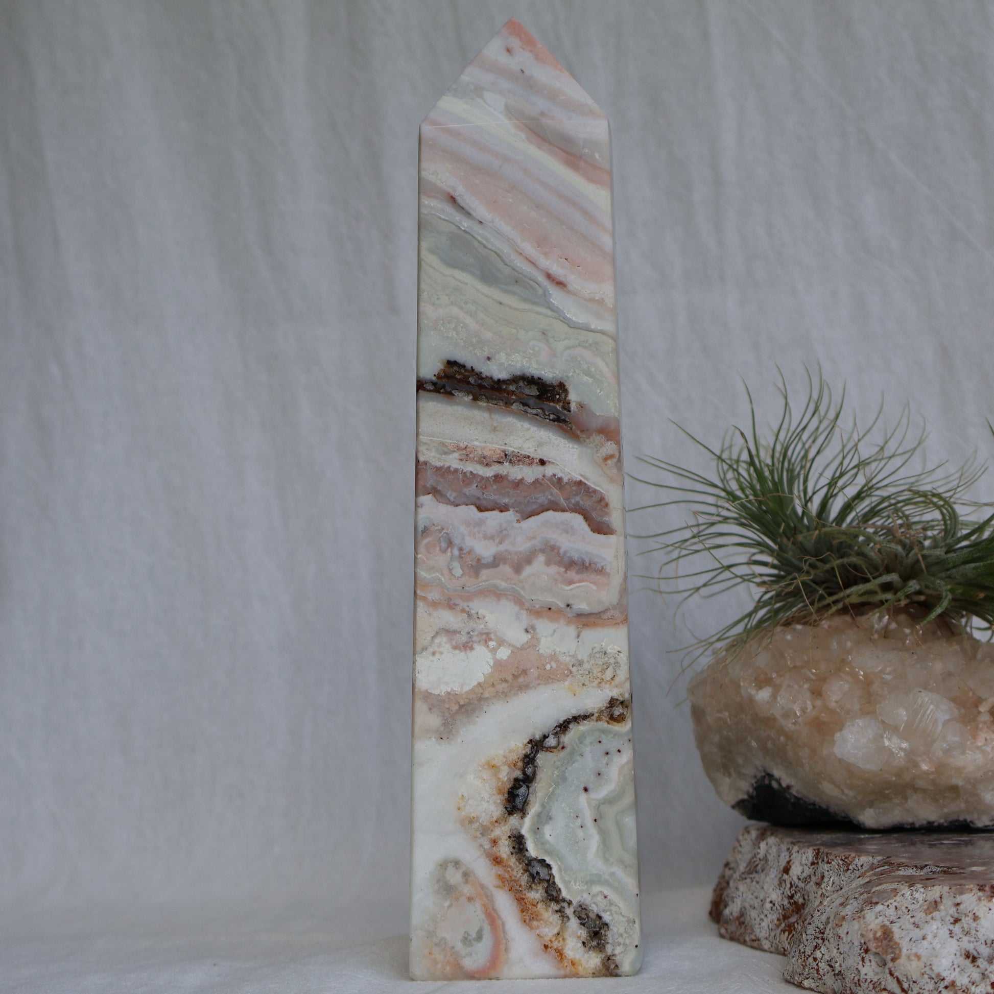 This stunning Crazy Lace Agate tower showcases soft pink hues and intricate natural patterns, making it a truly eye-catching piece. With its height and elegant form, it’s both a powerful energetic tool and a beautiful décor feature.