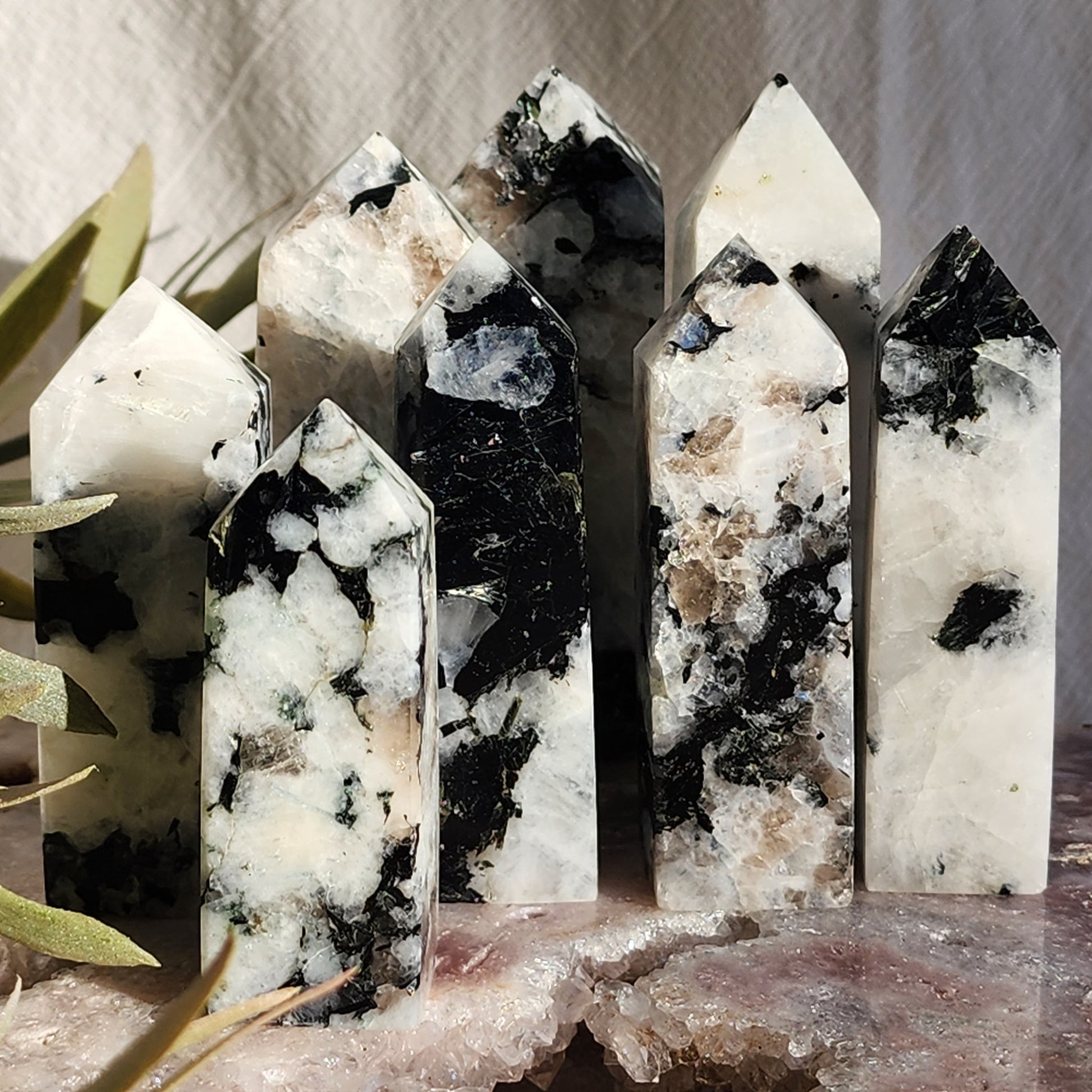 Elegant and luminous, these Rainbow Moonstone four-sided towers are radiant pillars of intuition, protection, and divine feminine energy offering a serene presence and a connection to inner wisdom.