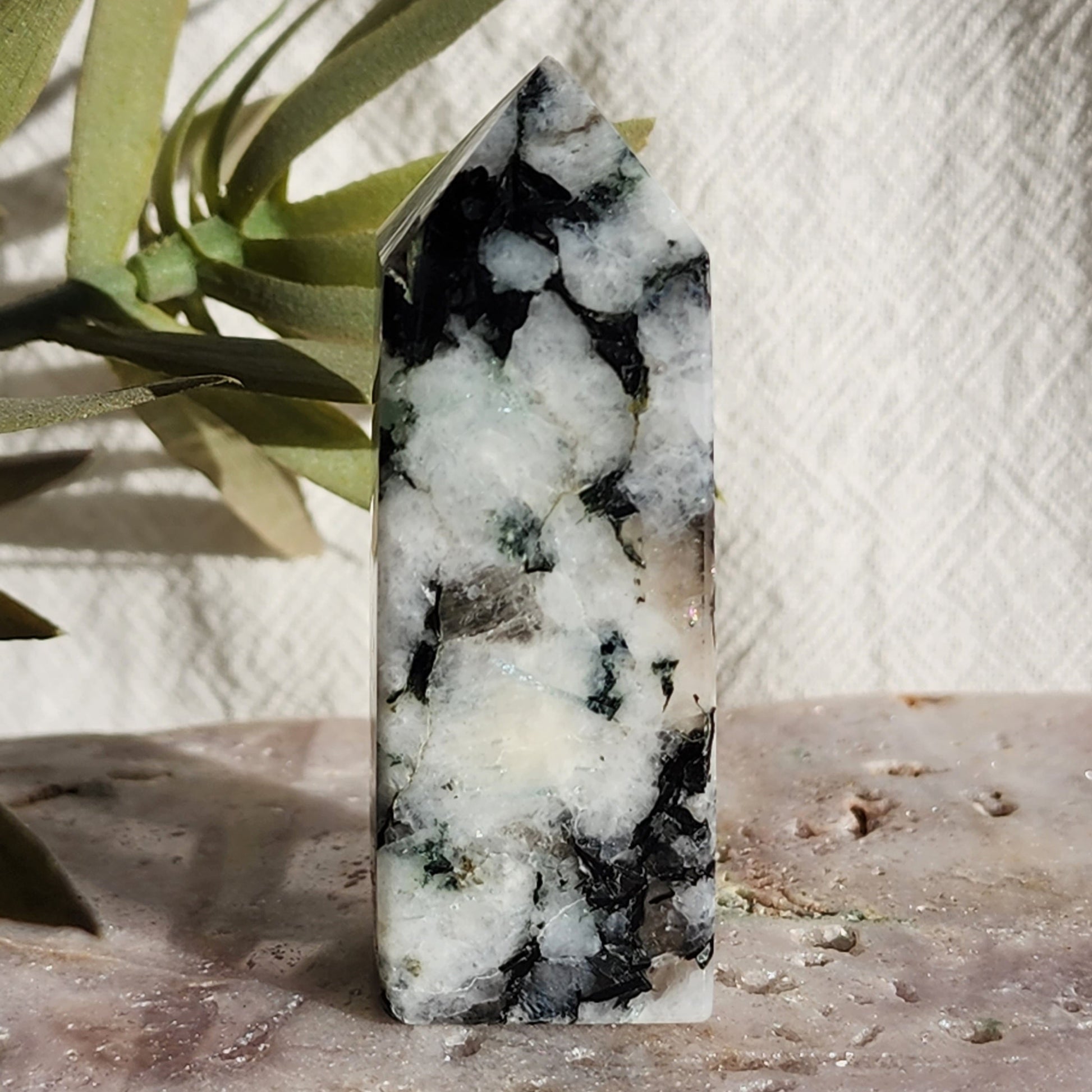 Elegant and luminous, these Rainbow Moonstone four-sided towers are radiant pillars of intuition, protection, and divine feminine energy offering a serene presence and a connection to inner wisdom.