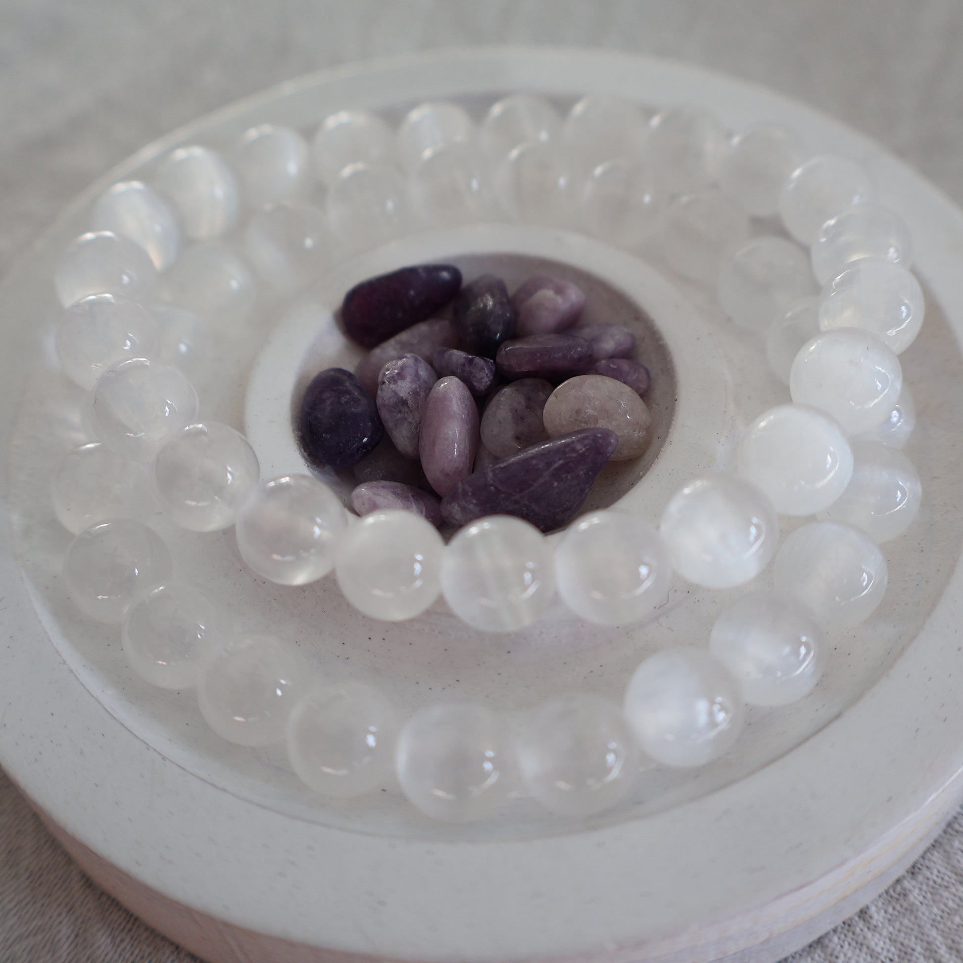 These 8mm bracelets feature luminous Satin Spar beads, known for their calming and purifying energy. Closely related to selenite, with a similar glow and metaphysical qualities, satin spar carries the same soothing, cleansing vibration that many crystal lovers seek.